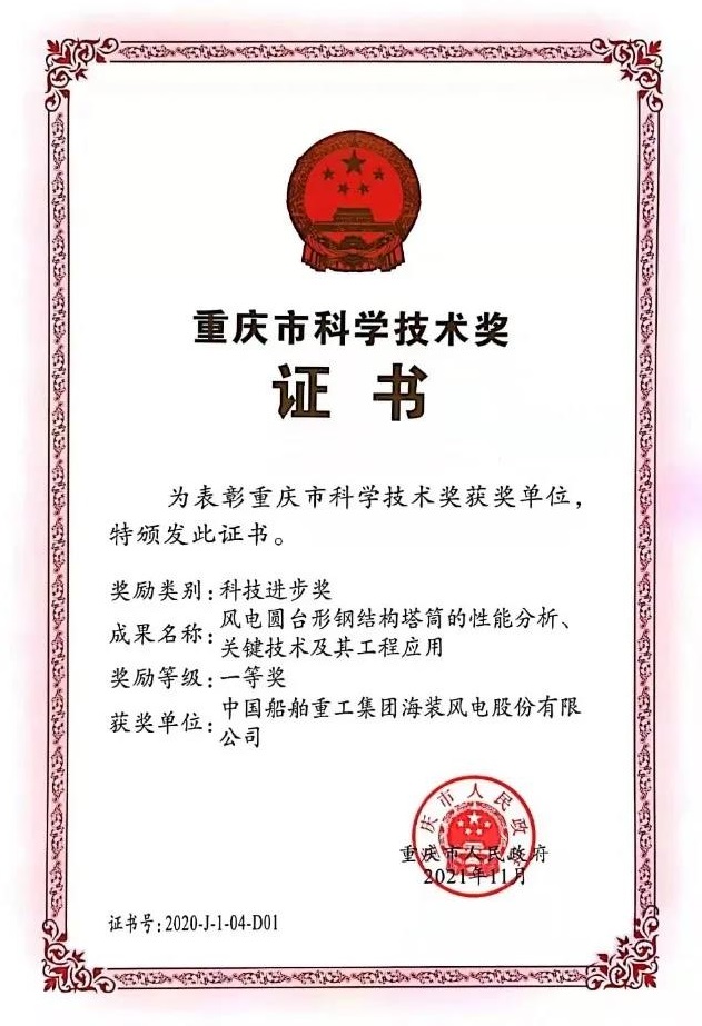 中國船舶集團(tuán)旗下中國海裝申報的兩項成果《高效安全大型風(fēng)電機(jī)組傳動鏈關(guān)鍵技術(shù)與應(yīng)用》《風(fēng)電圓臺形鋼結(jié)構(gòu)塔筒的性能分析、關(guān)鍵技術(shù)及其工程應(yīng)用》榮獲重慶市科技進(jìn)步獎一等獎。