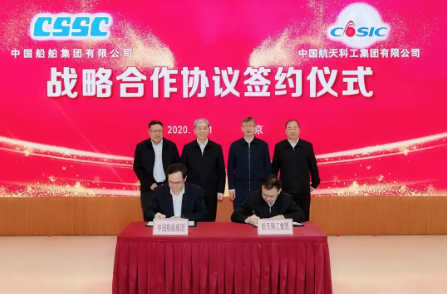12月1日,中國船舶集團有限公司與中國航天科工集團有限公司在京簽署戰略合作協議。中國船舶集團黨組書記、董事長雷凡培,黨組副書記、總經理楊金成,黨組成員、副總經理錢建平,中國航天科工黨組書記、董事長袁潔,黨組副書記、總經理劉石泉,黨組成員、副總經理龔波出席簽約儀式。楊金成、劉石泉分別代表雙方在協議上簽字。
