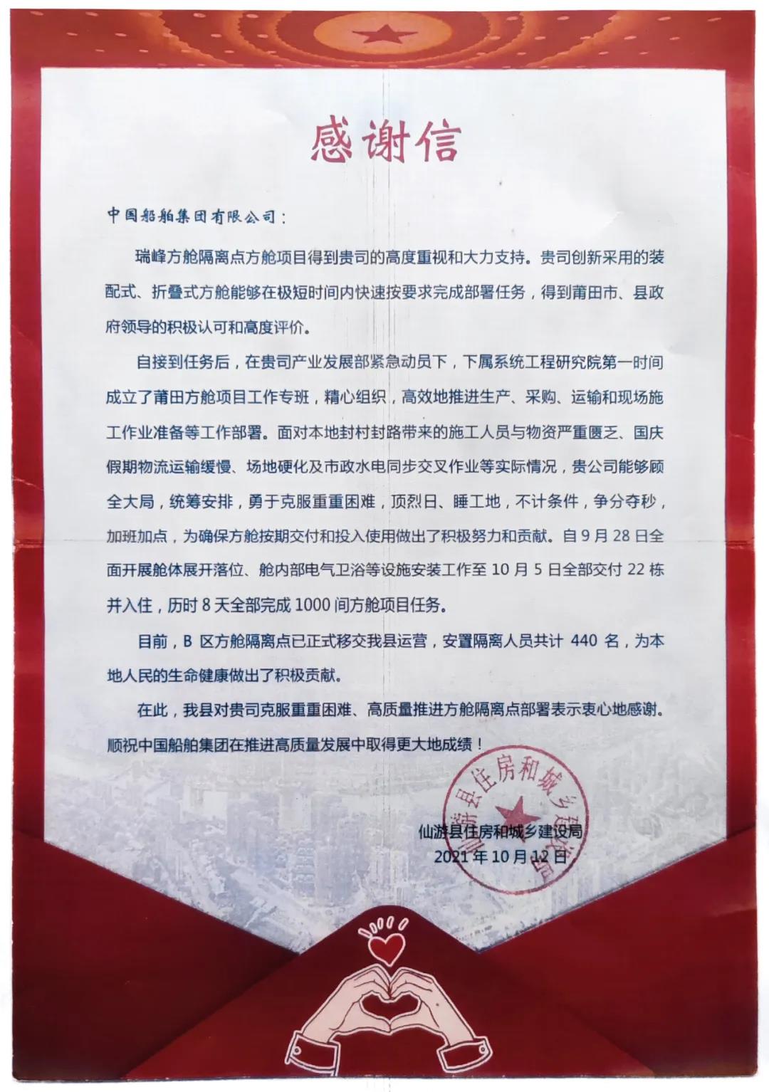 在此,我縣對貴司克服重重困難、高質量推進方艙隔離點部署表示衷心地感謝。順祝中國船舶集團在推進高質量發展中取得更大地成績!
