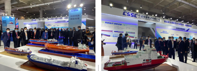 在創(chuàng)新船海裝備展區(qū),中國船舶集團(tuán)集中展示了清潔能源船舶、系列LNG船、系列集裝箱船、系列油船、系列散貨船、系列科考船、系列特種船和未來船舶八個(gè)板塊。