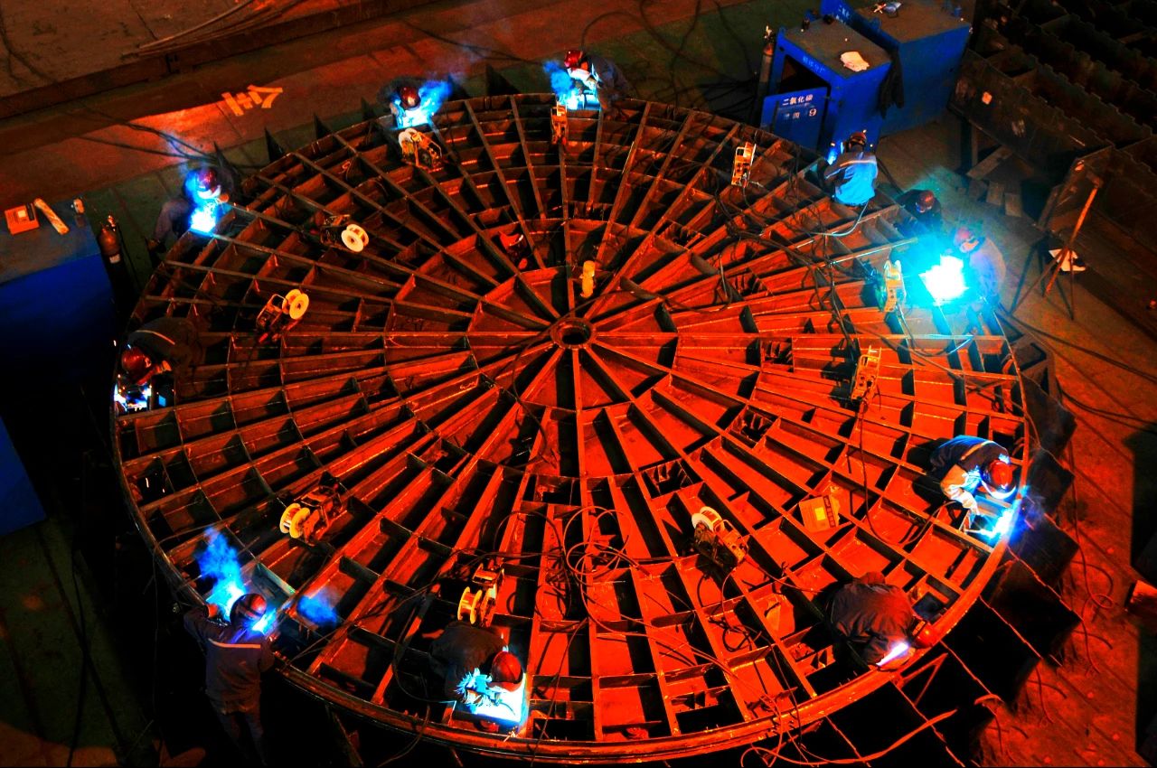 該作品反映的是造船工人在車間里焊接分段的場面。為了保證焊接件不受熱脹冷縮的影響而變形,需要十幾個(gè)工人從不同角度同時(shí)不間斷焊接,有時(shí)連續(xù)工作十幾個(gè)小時(shí),直至焊接件全部完成。在這不是戰(zhàn)場勝似戰(zhàn)場的車間里,每一名工人都在聚精會(huì)神地激戰(zhàn)著。