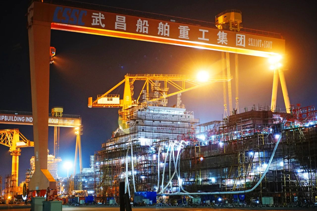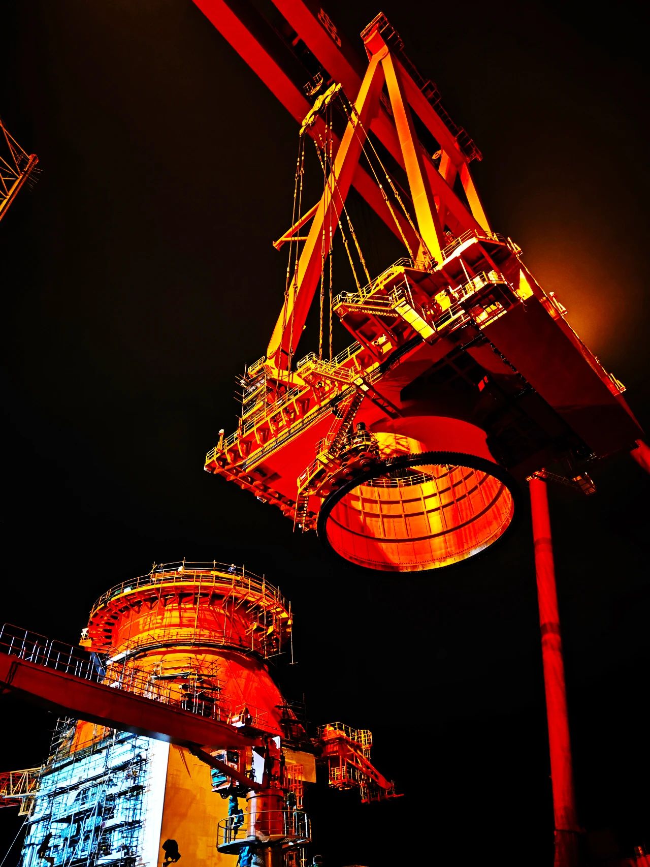 在武漢船機(jī)平臺(tái)總裝現(xiàn)場,華夏金租神大平臺(tái)配套的1200噸起重機(jī)正在安裝,大件吊裝各項(xiàng)準(zhǔn)備工作繁瑣,一切就緒時(shí),天已經(jīng)黑了,現(xiàn)場一鼓作氣開始吊裝對(duì)接,展現(xiàn)了船舶人只爭朝夕、不負(fù)韶華、忘我工作精神風(fēng)貌。