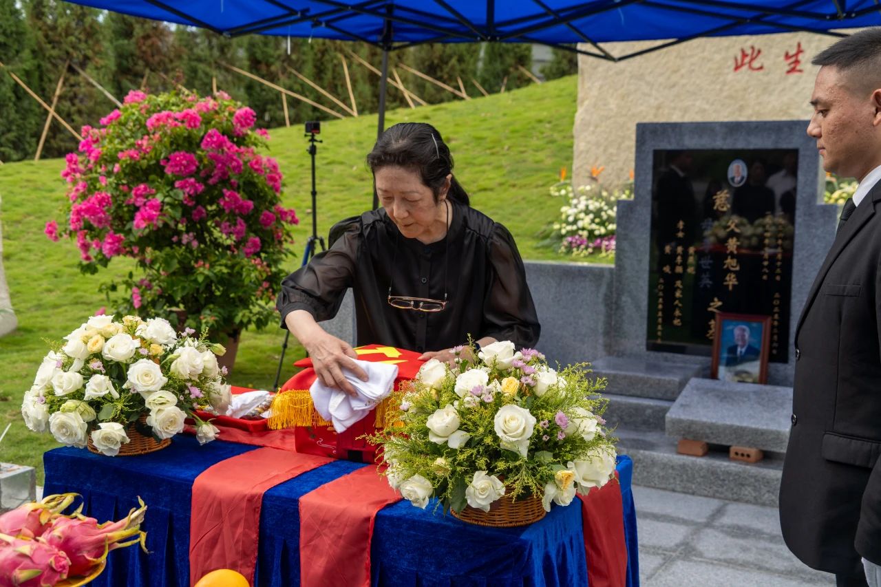 親屬代表擦拭墓碑后,在禮賓人員的引導下將黃旭華院士的骨灰安放進墓穴。人們向黃旭華院士墓碑行三鞠躬禮,并敬獻鮮花,以簡約而莊重的儀式,送別國之脊梁。