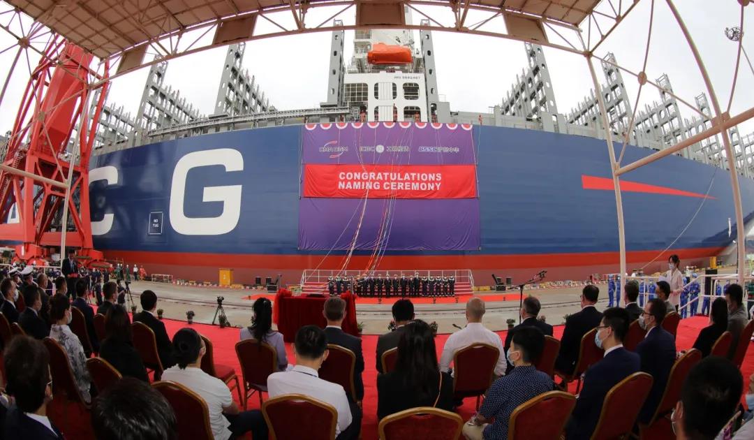 8月27日,由中國船舶集團有限公司旗下滬東中華聯(lián)合中船貿(mào)易為法國達飛海運集團建造的15000TEU超大型集裝箱系列船首制船“達飛·和風”號命名交付。這是中法兩國船海巨頭全面落實2019年中國國家主席習近平和法國總統(tǒng)馬克龍見證簽署的戰(zhàn)略合作框架協(xié)議的最新成果。同時,也標志著“CSSC超大型箱船譜系”又添“新丁”,實現(xiàn)了對全球超大型集裝箱船發(fā)展的引領。