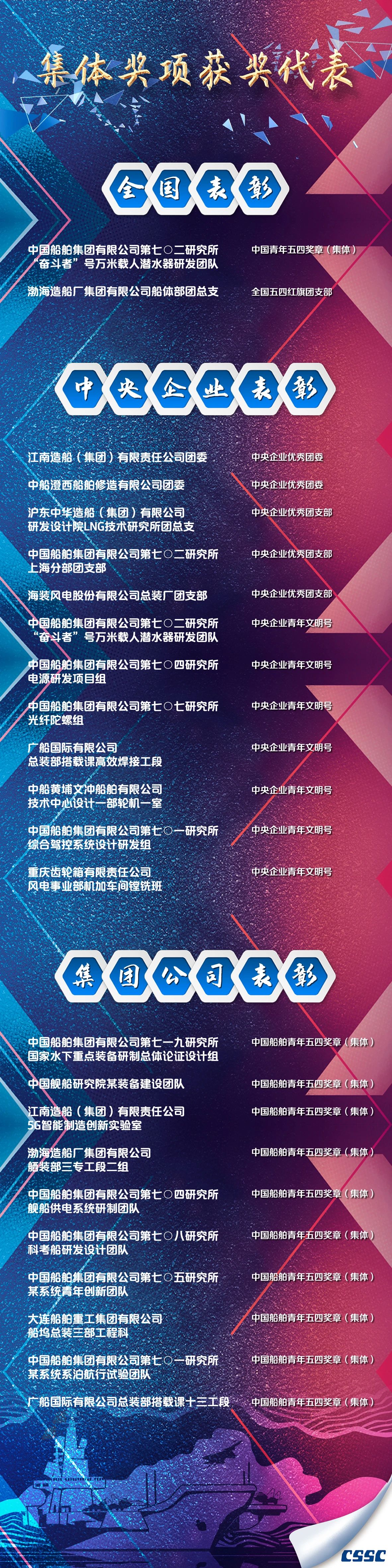 中國船舶集團各級團組織和廣大團員青年、團干部在高質(zhì)量發(fā)展、脫貧攻堅、疫情防控的主戰(zhàn)場,奮勇當(dāng)先、無私奉獻、勇立潮頭、勇挑重擔(dān),把青春旗幟插在了決勝的高地,涌現(xiàn)出一批勇?lián)鷷r代使命、引領(lǐng)時代之風(fēng)的先進青年個人和先進青年集體。
